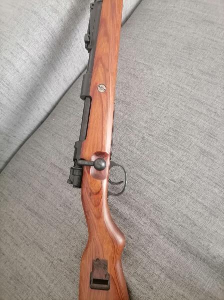Bonita pieza ; no soy un experto en el magnífico K98 pero parece una unidad compuesta en el arsenal en época en el que el 3Reich ya estaba con carestía ; te comento esto porque ni cantonera , ni abrazadera porta bayoneta y supongo que culata de madera laminada no corresponde con el año de fabricación ( 42 )