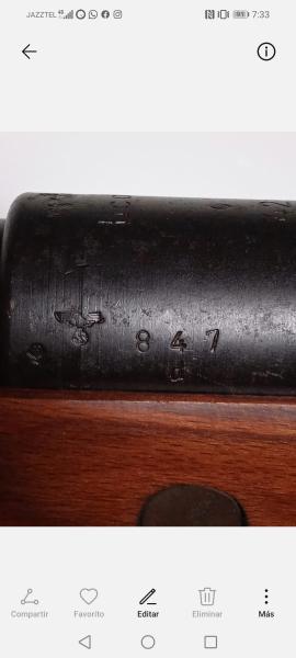 A lo dicho por el compañero Chinchu, que es correcto, añadir que el doble marcaje de fabricante del fusil (bcd = Gustloff Werke) y (ar = Mauser Borsigwalde) se debe al envio de piezas de una factoria a otra. En este caso de la Gustloff a la Mauser Borsigwalde donde esta última, aunque la pieza ya iba marcada por el fabricante del que provenia, (bcd) añadió su código, (ar) al completar la fabricación del fusil.