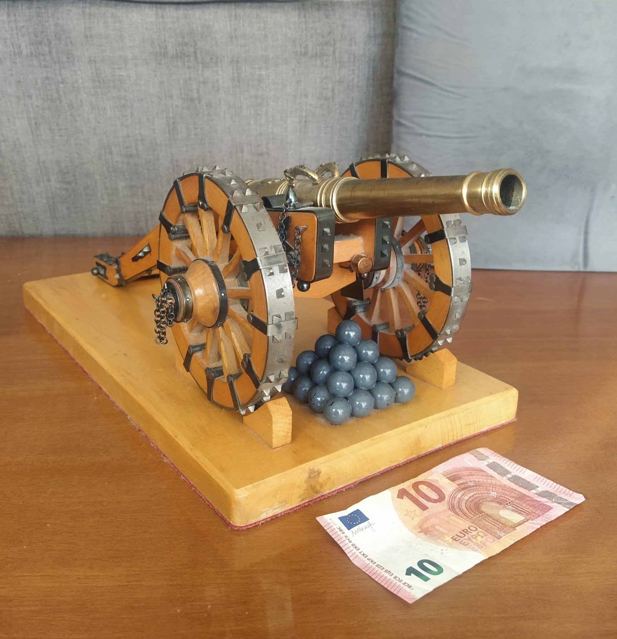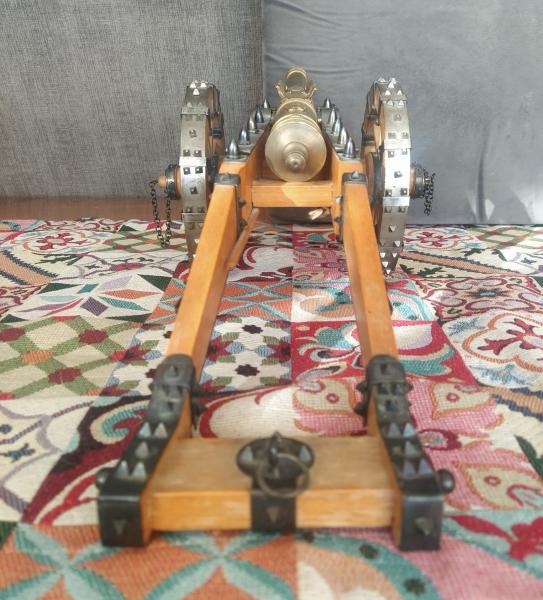 Excelente réplica histórica y decorativa de cañón antiguo (no operativo) en latón, haya y metal, construido artesanalmente, pieza a pieza -cadenas, argolla a argolla; clavos ruedas, uno a uno; etc- (sólo hay dos hechos por el mismo artesano hace 40 años) siguiendo los planos (escala 1: 14 aprox.) de un cañón similar expuesto en el Museo Alcázar de Segovia. Desmontable el cañón de su cureña así como las ruedas, similar a uno de verdad. Miles de piezas y cientos de horas de trabajo. Separable de su base decorativa. Ruedas con arcos segmentados, como uno verdadero ( garantizan soportar el peso de una persona de 100 kgs subido en ellas) y cañón pivotante. Preferiblemente se entrega en mano en Madrid capital. Precio: 3.500€