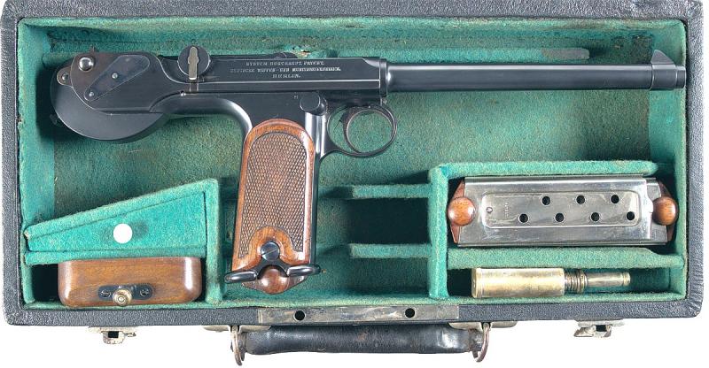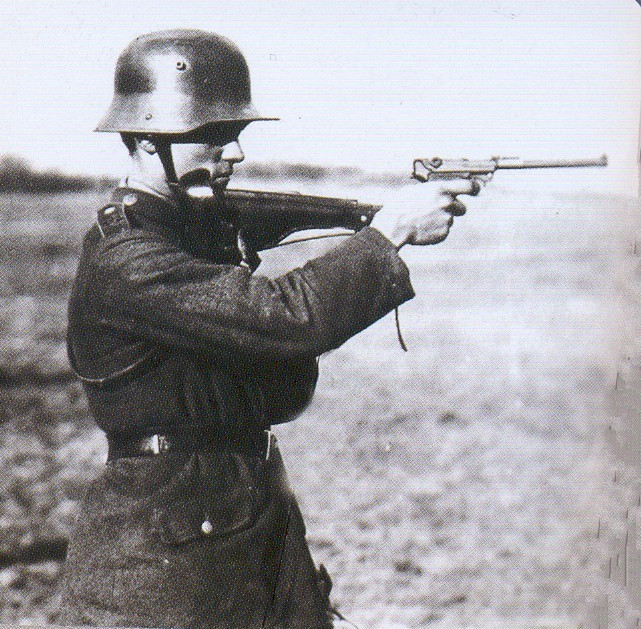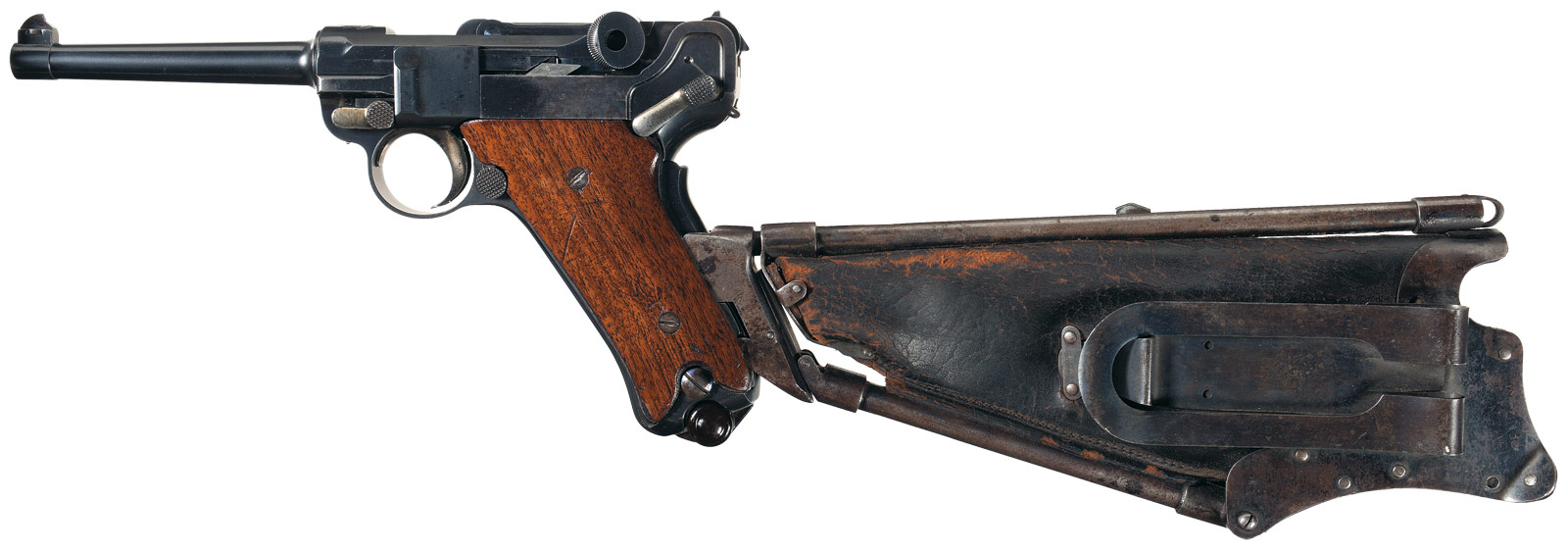 La funda que porta el buen señor es una patentada en America, que podia desplegarse hasta formar un culatín acoplable al arma, con lo que tenias una Luger Carabina por "pocas perras".
