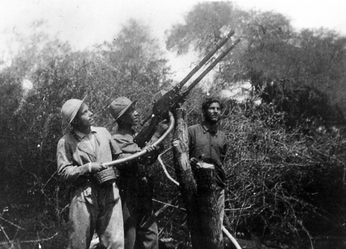 abajo arrodillados dos soldados paraguayos sosteniendo ametralladoras Madsen modelo para aviones