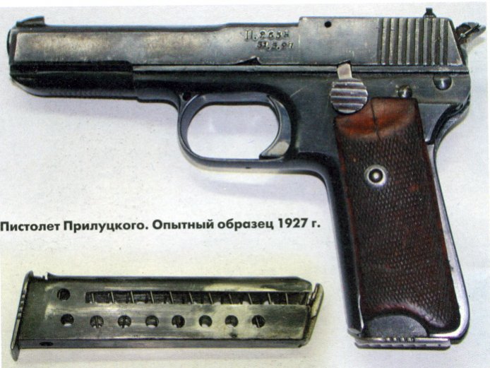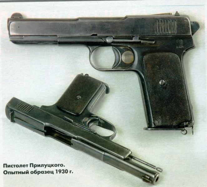 La primera es una pistola soviética Prilutskiy M30 en calibre 7,62 mm y efectivamente fue la competidora de la Tokarev TT-30, evolucionada después a la TT-33, cuando los soviéticos buscaban en 1930 una pistola para ser la reglamentaria en sus Ejércitos.