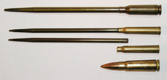 Un detalle de la munición del .35. Era una punta en la que solo la mitad anterior iba recubierta de una aleación de cupro-niquel. La parte inferior, un poco más dimensionada, permitía que solo el plomo entrara en contacto con el rayado, para un contacto suave.