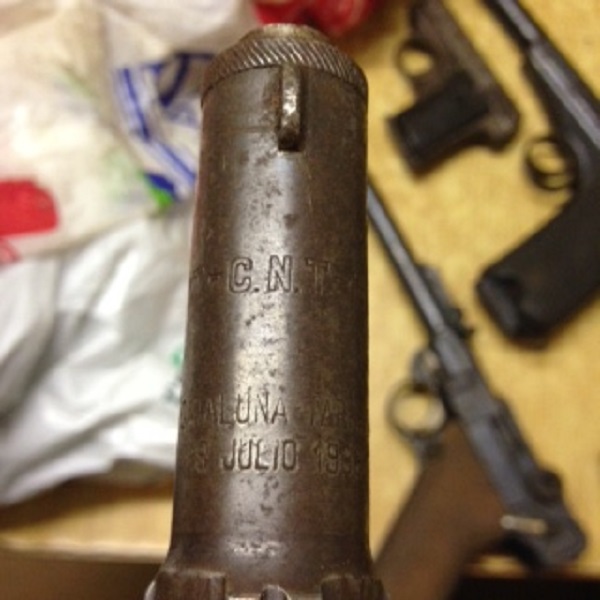 Este afortunado coleccionista americano no tiene otra cosa en mi modesta opinión que un "trofeo de guerra" anarquista arrebatado a un Guardia Civil precisamente durante nuestra Guerra "incivil" y marcada posteriormente como C.N.T., precisamente encima del emblema "benemerito"