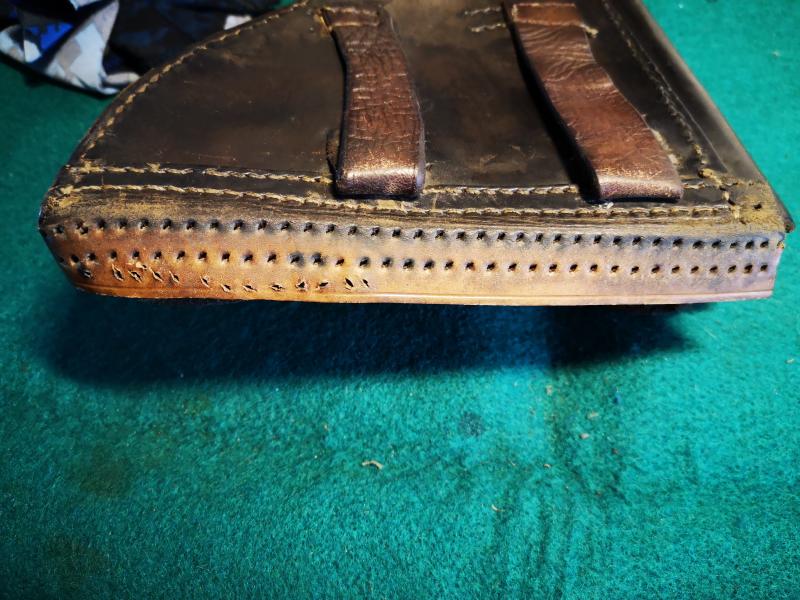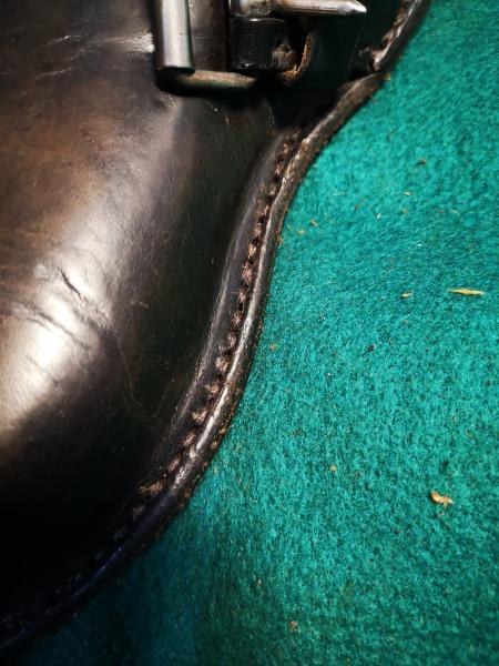 Las trabillas traseras han sido cambiadas en época y han envejecido muy mal. La bolsita portaherramienta se cambió, pero fue una total chapuza. Falta la tapa.
