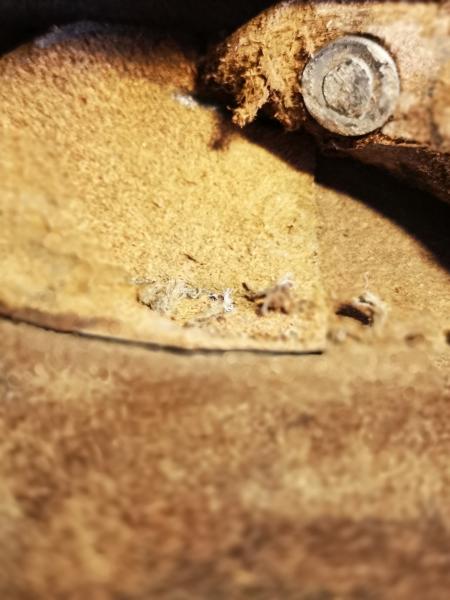 Observamos el desgaste de la "Flor de cuero" en la frontal, que intentaremos reparar en la siguiente restauración.