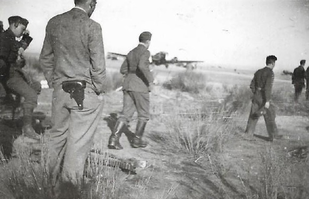En esta imagen podemos ver en un Aeródromo de la Legión Cóndor, posiblemente el de la Virgen del Camino de León, a un grupo de pilotos vestidos todavía con ropa civil.