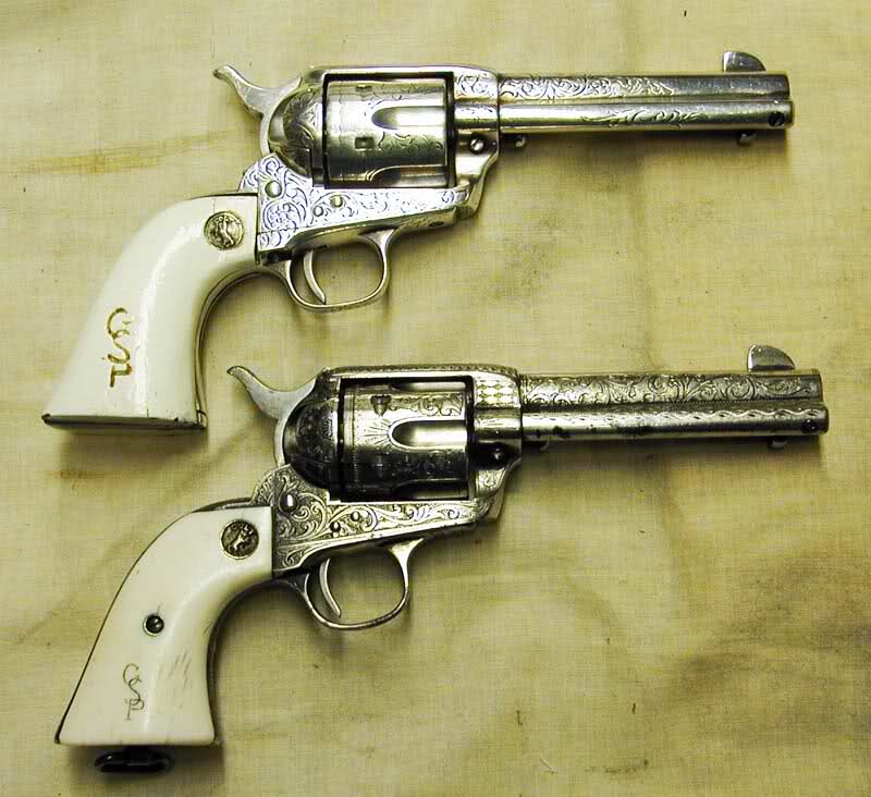 Los revólveres son Colt Single Action Army en calibre .45.