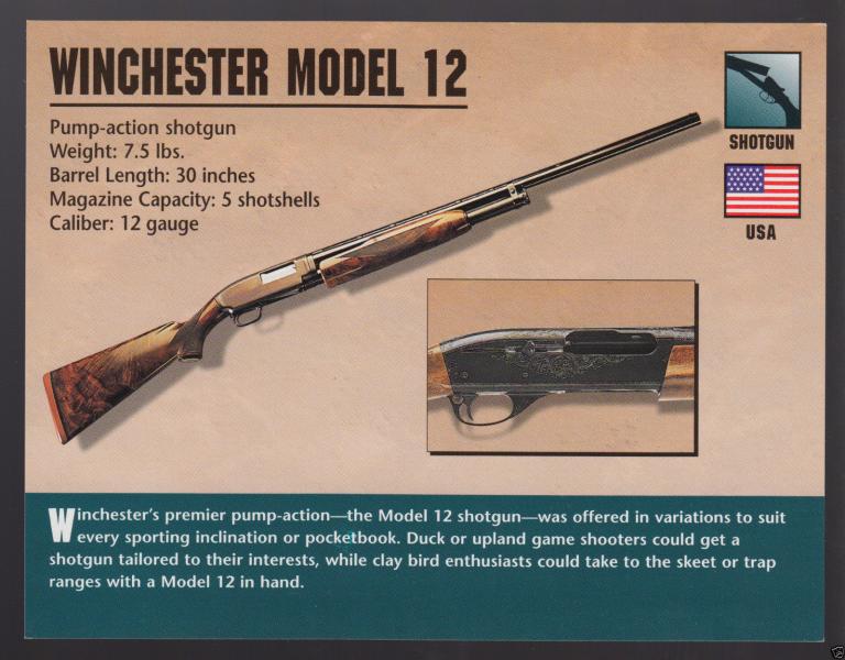 Después de un arduo trabajo que duro varios años, en 1912 ve la luz la Winchester modelo 1912 de calibre 20 y en 1914 en calibres 12 y 16, mas tarde concretamente en 1919 pasara a denominarse como Winchester modelo 12 o M12 en su versión Trench Gun, el cese de su producción a gran escala se producida en 1963 causando una autentica conmoción en el sector, pese a ello, se siguieron produciendo modelos en series muy limitadas bajo pedido a estas series se las denomino como “Post-64”hasta el mes de enero del año 2006 fecha en que se cerró definitivamente su producción, fue sustituida en 1964 por el modelo Winchester modelo 1200, se habían vendido 2.000.000 de unidades y su reputación es tal que se la denomina la “repetidora perfecta”.