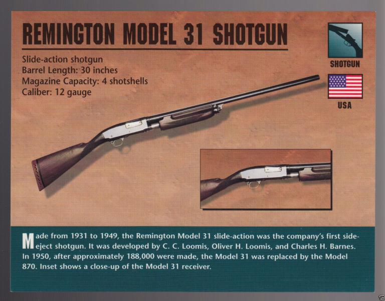 En 1931 sale al mercado la Remington modelo 31 y sorprende a todo el sector ya que rompe con el diseño de ventana única típico de la marca en ese momento presente en los modelos 10,17 y 29, adoptando una configuración de doble ventana la inferior para alimentar y la superior derecha para expulsar, también llama poderosamente la atención el nivel altísimo de la calidad de sus componentes ya que todas las partes metálicas son forjadas y pavonadas o de inoxidable en su acabado final de una calidad de acero máximo, la calidad y acabado de las partes de madera también son muy altos, todos los trabajos son hechos a mano con lo que el acabado general es de 10 sobre 10, está claro pues que el modelo 31 pretende luchar por la supremacía con la Winchester 12 con sus mismas armas, calidad, fiabilidad para conseguir una larga longevidad.