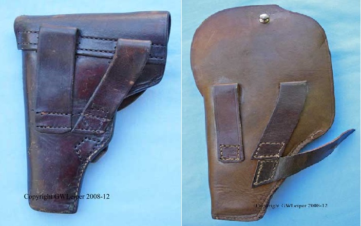 Las cuadrangulares (como la funda clara de la derecha) iban unidas a una banda ancha de cuero por dentro de la cual se metía el cinturón e iban principalmente destinadas a la Aviación y Marina Soviéticas.