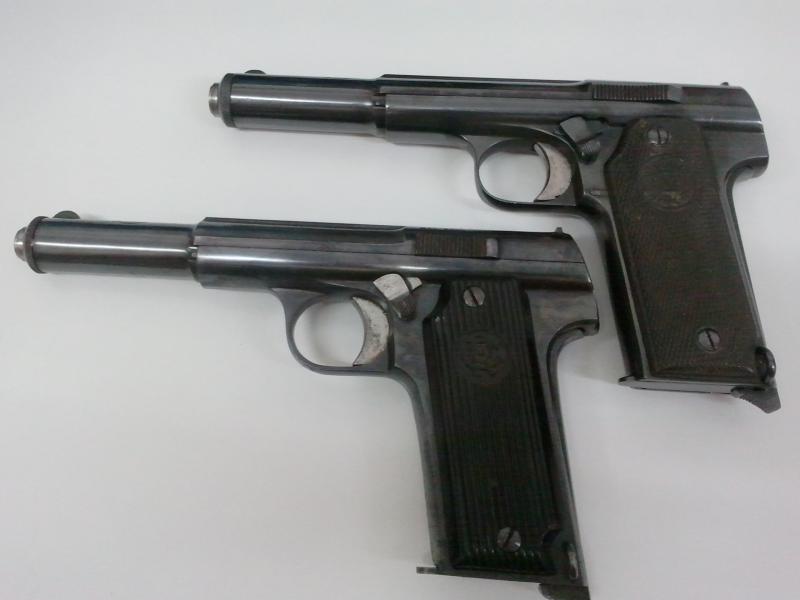 una es una RE , copia de la Astra 400 , la otra una Astra 400 con el emblema de Carabineros , ni son fabricadas por una misma compañia ni las dos son Astra , solo una de ellas