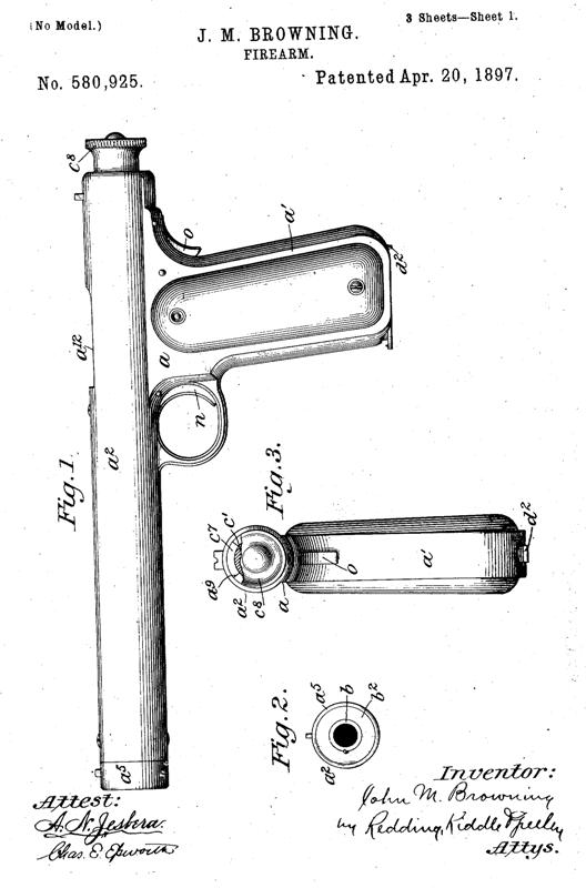 Aquí vemos la introducción de la seguridad de agarre popular que ha encontrado su camino en los diseños de muchos de pistola desde 1897. John Browning utilizó la ronda de calibre .38 ACP de nuevo para esta pistola semi-automática. Otra característica que se introdujo con esta patente era un sistema de retroceso de bloqueo. Un rápido vistazo al dibujo de la patente y te darás cuenta de este diseño se destaca en comparación con sus otros diseños. Colt comprado este diseño y lo probó, pero nunca se avanzó en la producción. El diseño ganó John Moses Browning Patente de EE.UU. 580.925 el 20 de abril de 1897. Él había solicitado esta patente el 31 de octubre de 1896.