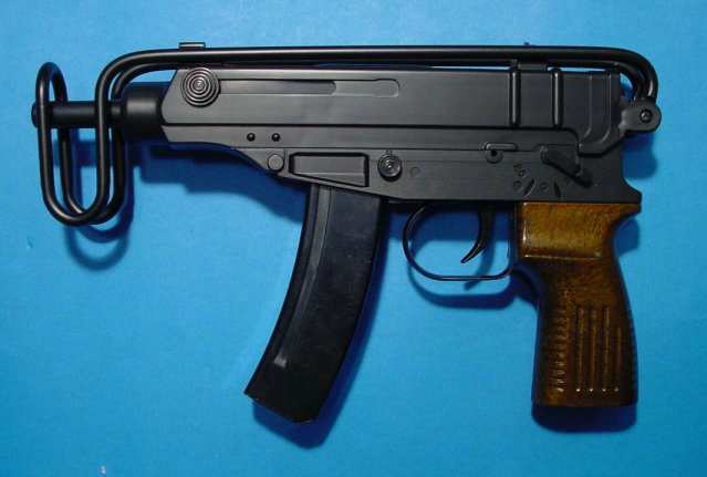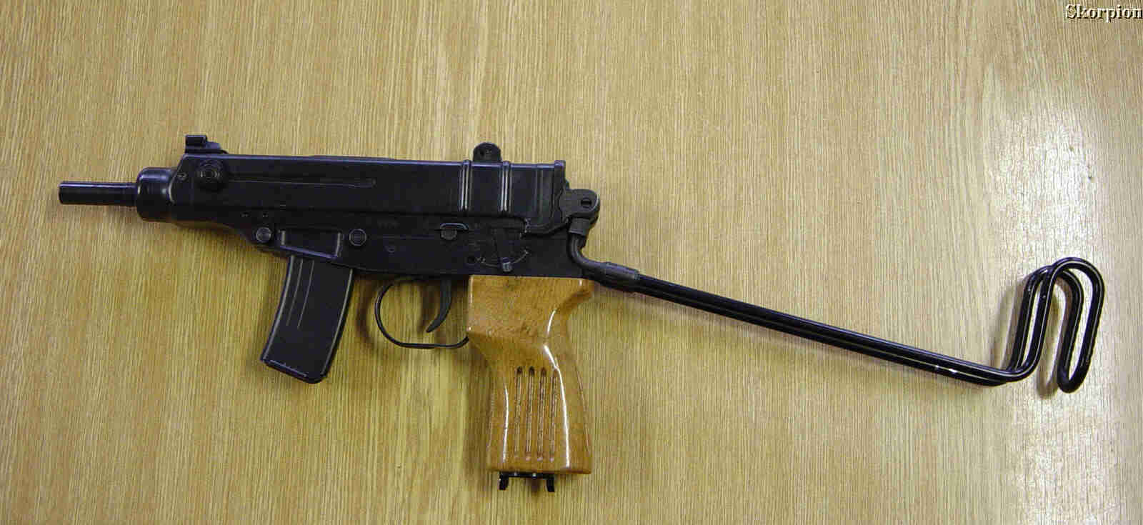 Por supuesto que es el vz-61 Scorpion, un arma que siempre me ha llamado mucho la atención, no se le encasilla como subfusil, ni como pistola ametralladora: en la 1ª se queda corto, pues dispara el 32 ACP, y en la 2ª se pasa por dimensiones y el culatín rebatible...además tiene un curioso regulador de cadencia de disparos, alojado en la empuñadura...