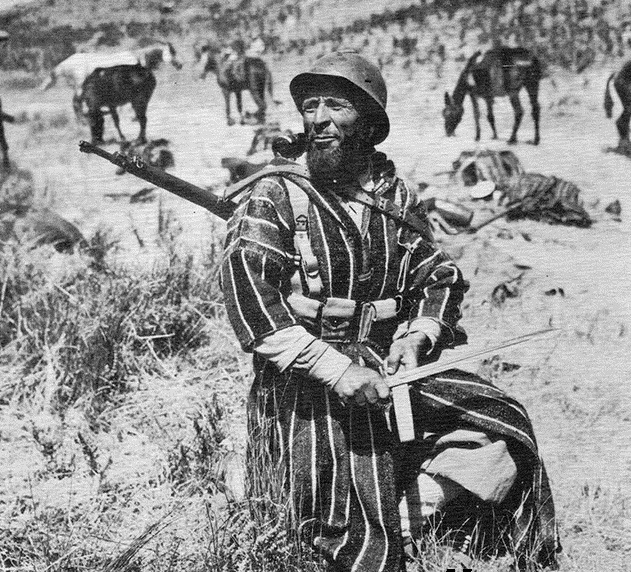 Si no me equivoco eran Goumiers marroquies de las montañas del Rif al servicio de Francia en la Segunda Guerra Mundial por el Garand M1 que aparece en la foto...me imagino que el teatro de operaciones de Italia y al mando creo que estaba el general francés Alphonse Juin!Buenos combatientes pero muy feroces aunque idoneos para el combate en montaña.