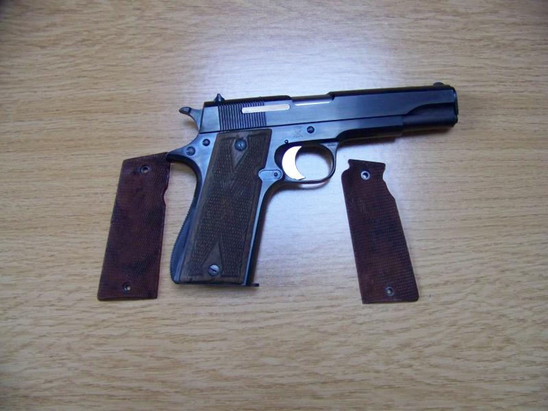 Suponiendo que no esté equivocado, esas cachas deberian de ser de madera, cuadrilladas y con dos pequeños rombos en la parte superior e inferior de las mismas.