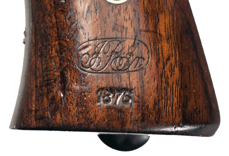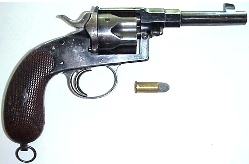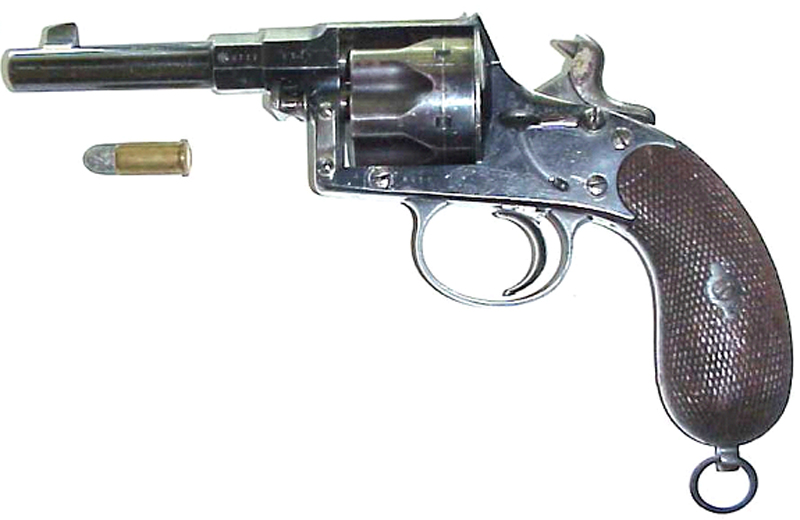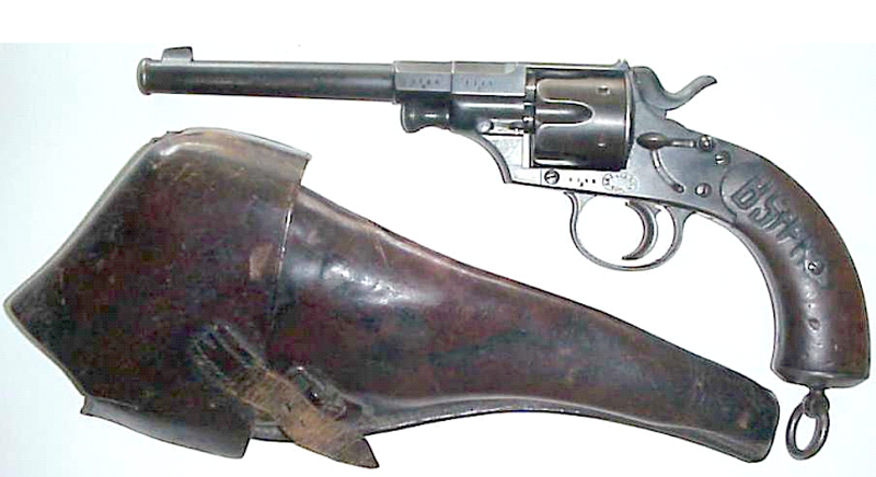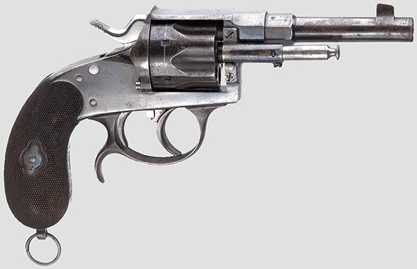 se trata del Reichsrevolver modelo 1879 (M 1879), reconocible gracias a que la base de la empuñadura tiene un talón metálico, que es parte del armazón.