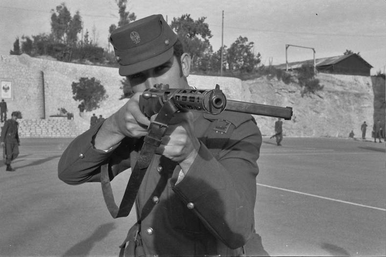 pues la pareja de grises tiene a la izquierda un mosqueton Mauser oviedo modelo 1916 del 7x57 Mauser y a la derecha un subfusil Coruña del 9 largo