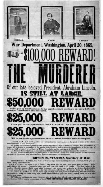 Os pongo una foto del asesino, que murio durante su huida en un tiroteo el 26 de abril de 1865 y de la ejecucion de sus complices, entre ellos una mujer el 7 de julio de 1865, uno de los carteles anunciado la recompensa ofrecida por la captura del asesino y complices
