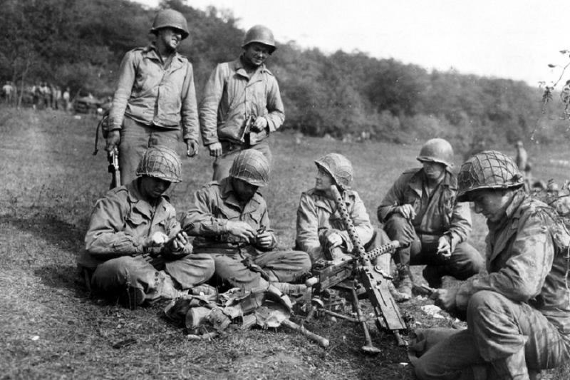 Y el que esta limpiando su M1911, el sentado a la izquierda del todo, se va a volver loco buscando su cargador hasta que se de cuenta que lo tiene delante, a la derecha de su rodilla