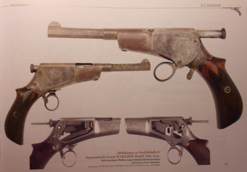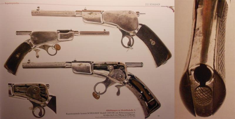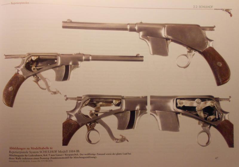 SCHULHOF también probó con el calibre .320 corto de revolver, ya en 1886, con carga por la base de la empuñadura, y un cañón algo más corto. Capacidad para 8. Adjunto fotos de este modelo.