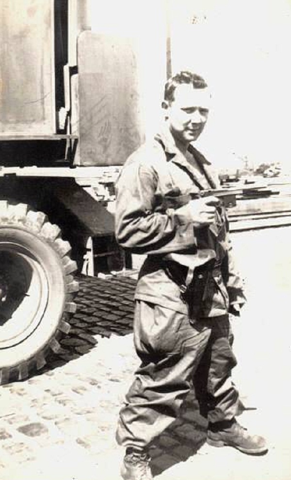 Es una Bergmann 1921 en manos de un soldado americano seguramente capturada a un alemán por la funda de Luger que lleva, y que a su vez estos habían capturado a los daneses.