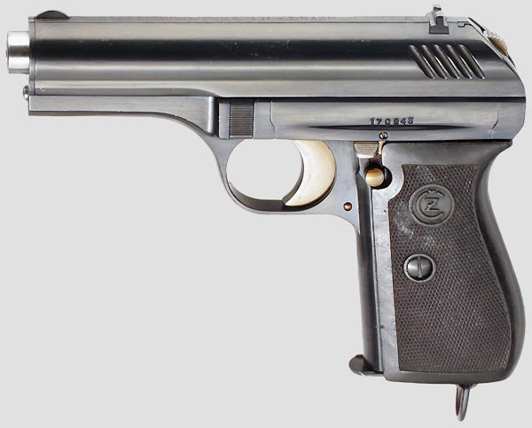 La primera pistola es una Cz 24 en calibre 9 corto. Podría ser fácilmente confundida con la Cz 27 en 7,65 pero esos surcos de agarre oblicuos y más marcados en la parte posterior de la corredera no dejan lugar la duda.