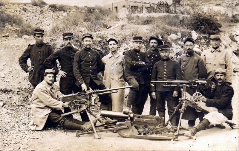 Bueno , como nadie lo ha descrito hasta ahora dire que las tres ametralladoras de izquierda a derecha esta la francesa Hotchkiss 1914 del 8mm lebel 8x50 R , la del medio es una MG-08 del 8x57 Mauser con su tripode pesado y a la derecha tenemos la Francesa Saint-Etienne 1907 del 8x50R sobre tripode Omnibus si no me equivoco