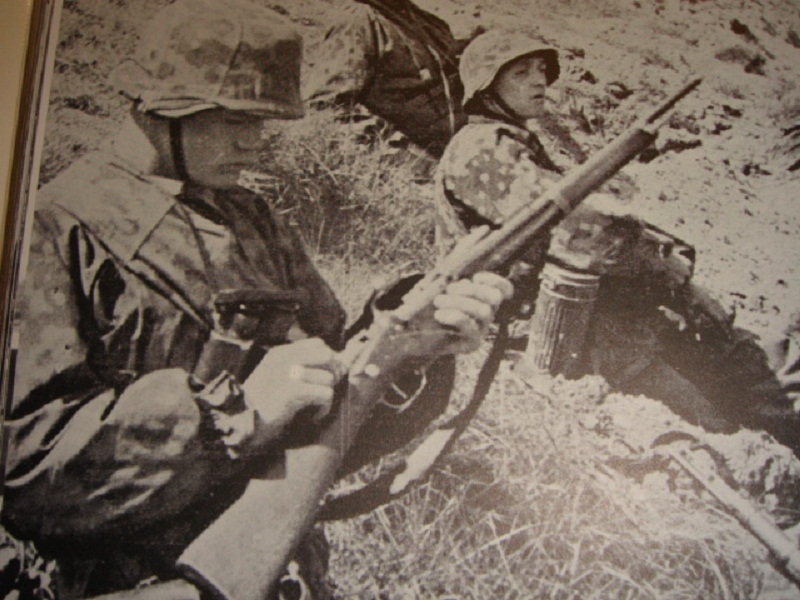 En esta otra conocidísima imagen que dejo el soldado que dispara el SVT lleva además en el cinturón una funda holandesa también capturada para la pistola belga FN 10/22.