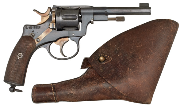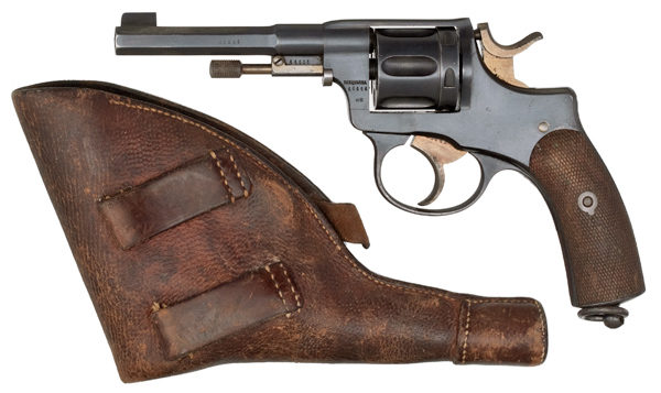 Revolver reglamentario sueco Modelo 1887 fuego central en 7,5 mm Nagant, que no es otra cosa que un Nagant belga modificado en los primeros adquiridos, y pasa a ser un Husqvarna fabricado en Suecia.
