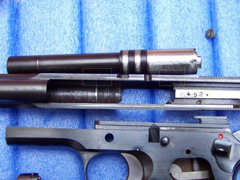 A mi me pareció una explicación a los marcajes de la corredera, por lo que no le dí más importancia al asunto, pero al conseguir el famoso libro hace unos dias, volví a desmontar el arma para examinarla a la luz de lo que dice este, y me fijé entonces en los números que aparecen marcados en los dos subconjuntos.