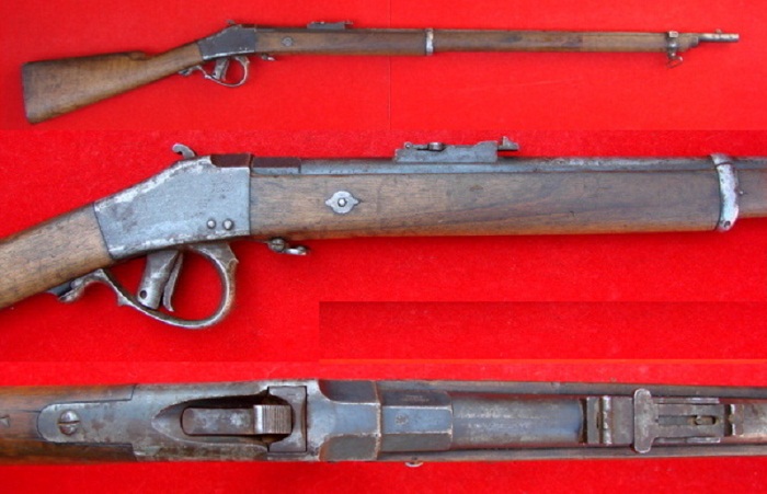 Es un rifle monotiro de calibre 11x50R que se carga a mano y se expulsa a mano...la apertura del cierre y percutor se realiza bajando el guardamonte que hace de palanca...