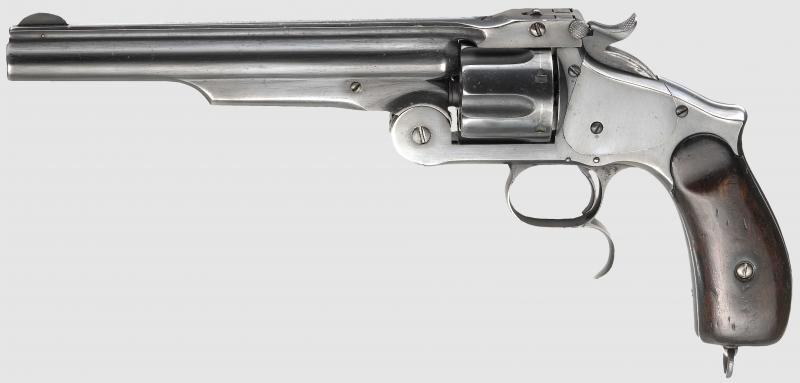 El revolver parece un Smith and Wesson, cal 44 Russian, efectivamente, pero es el modelo 2, con alojamiento del extractor largo. El modelo 3 lo tiene bastante más corto. Por lo demás son iguales.
