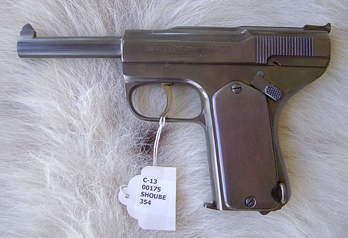 Es una rara pistola Schoube M1907 danesa diseñada por el militar del mismo nombre y que pretendió con poco éxito convertirse en reglamentaria de ese ejército.
