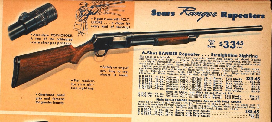 Catalogo de 1933 de Sears, aquí se aprecia la diferencia de precio, las armas están producidas por Savage arms co, vemos una 520A y una Savage 720, esta ultima, construida bajo licencia de la Auto-5 de Browning, como marca Ranger.