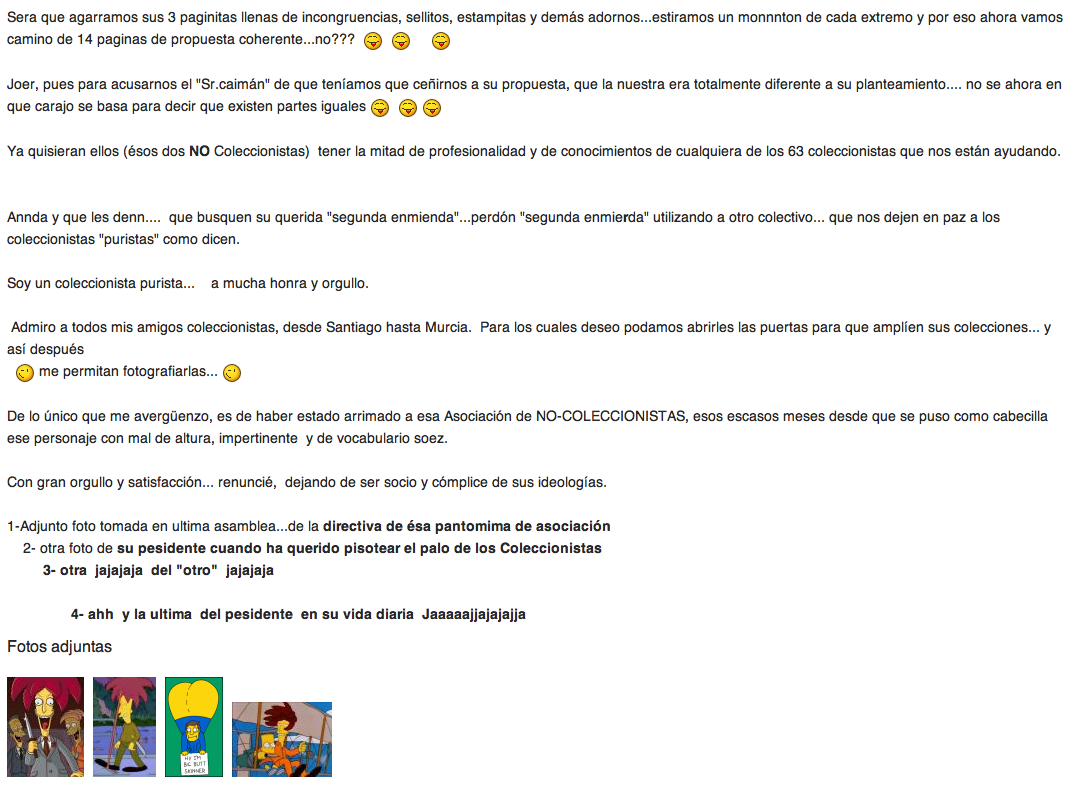 No te preocupes por nuestra Asociación, como entenderás es lícito y saludable el que haya diversidad de opiniones, mensajes y propuestas ante la ICAE, y mas si viene directamente del Colectivo de coleccionistas, eso no te quepa duda, aunque por lo visto no os gusta que nos hayamos unido alrededor de una organización dedicada al coleccionismo. Las explicaciones, mejor dicho, el debate de ideas se realiza entre los implicados y los que espontáneamente se suman por sentirse identificados con la causa y el propósito, no con cualquiera que no sabe nada del tema y lo que dice lo hace desde la mala intención y sus ganas de malmeter por el hecho de quedarse fuera de juego.