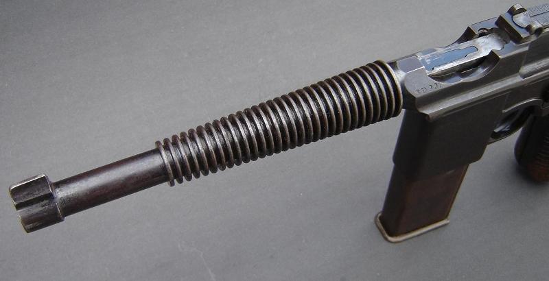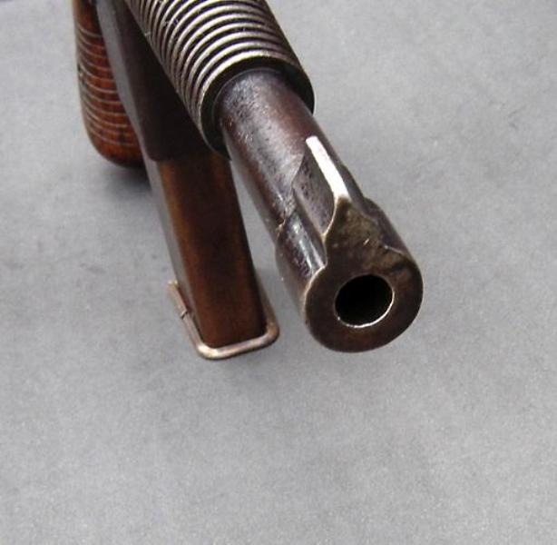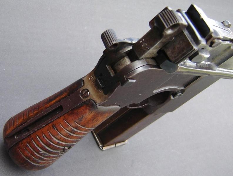 En la cacha de esta maltratada pistola tipo ruby parece adivinarse una cabeza de león enmarcada en un círculo de borde decorado típica de las pistola Benemérita, marca comercial con las que D.F. Ortega de Seija distribuyó en Madrid este tipo de pistolas eibarresas en calibre 6,36 y 7,65 mm.