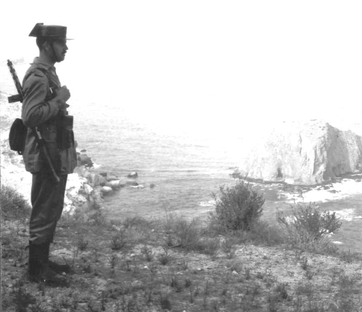 Macuvi, lo que lleva este Guardia Civil al hombro es un subfusil automático ametrallador Coruña Modelo 1942 en 9 Largo, copia española del alemán Erma EMP 1935 del 9 Parabellum.