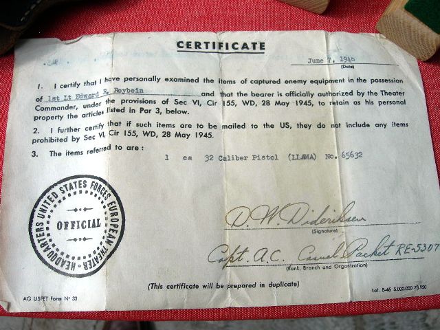 Como ejemplo recordamos esta pistola marca Llama Modelo I en calibre 7,65 mm importada por Geco que posee un documento oficial del Ejército Norteamericano fechado en 1945 que la certifica como arma de captura durante la Guerra.
