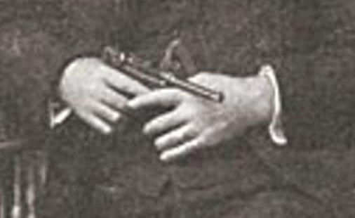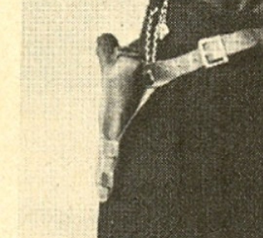 Detalle curioso en esta foto es que la pistola va provista de lo que los ingleses llaman "lanyard", es decir, una cinta que si no estoy equivocado era casi siempre de cuero, y que servia como "fiador" de la pistola para evitar su pérdida.