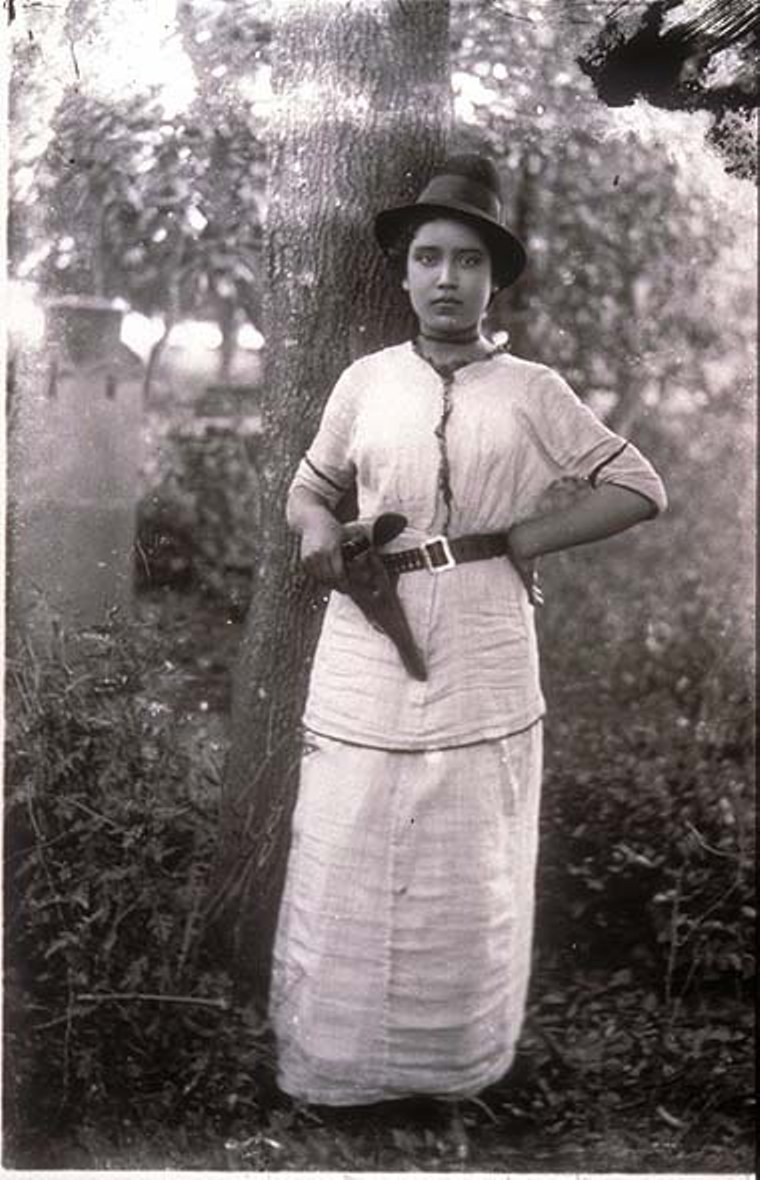 Una "Soldadera" Zapatista posa durante la Revolución Mexicana sacando una Parabellum de su funda.