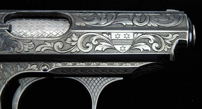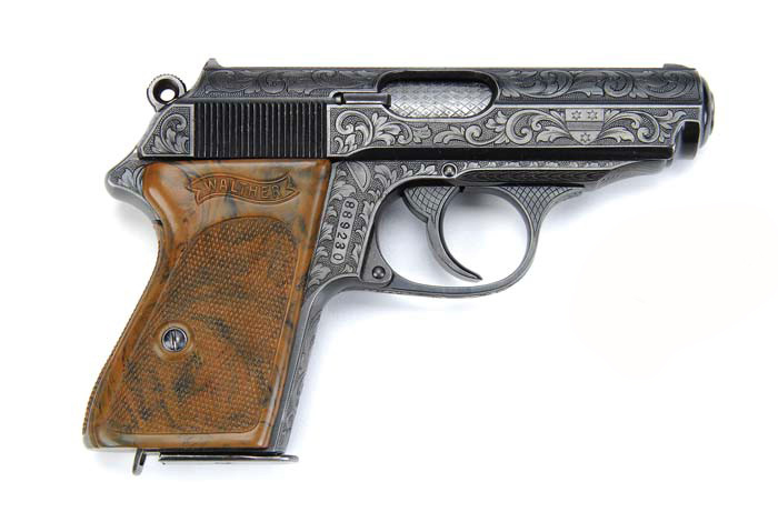 Y ya que vamos con pistolas de personajes conocidos, a ver si sabéis a que personaje famoso del régimen nazi le fue regalada esta Walther PPK bellamente grabada ? Se dice que es probable que fuera un regalo del propio Hitler. No hay pruebas de ello.