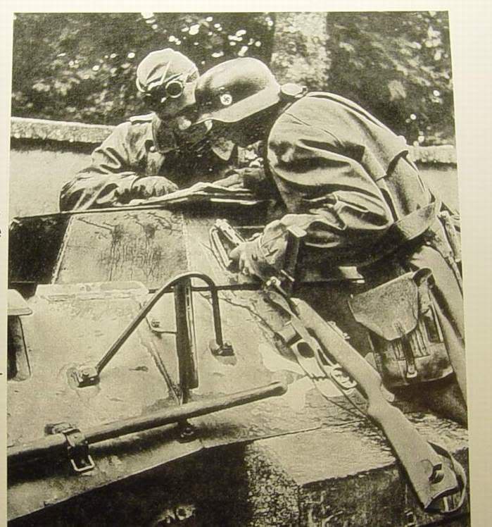 Lo que a mi me llama la atención en esta foto no son los subfusiles, sino el casco del soldado que aparece a la izquierda de la foto arriba, con un fusil......... parece un M-35 alemán !!