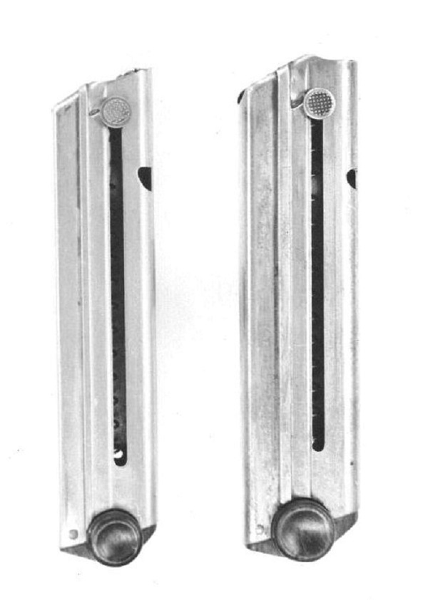 Aquí vemos una comparativa entre un cargador de una P.08 estándar en calibre 9 mm y un cargador de una Parabellum en calibre .45 ACP.