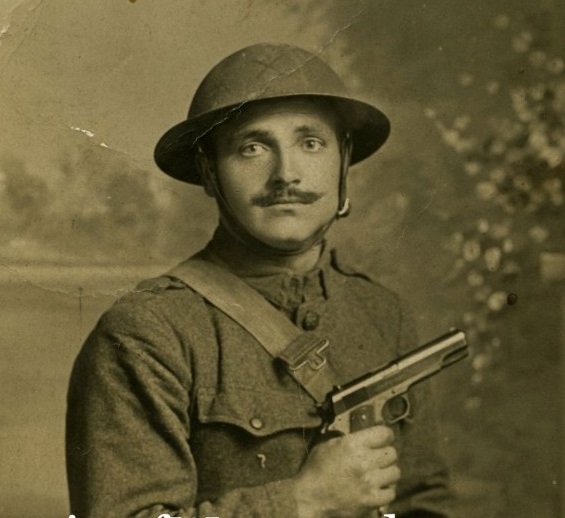 Una de las primeras Colt 1911. No soy capaz de distinguir por el uniforme si está en manos americanas o inglesas.