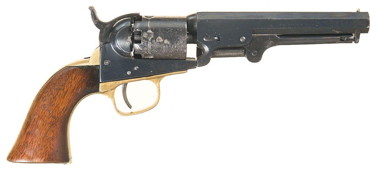 Este es el revólver Colt Pocket 1849 que en el año 1855 fue declarado reglamentario para los Oficiales de las tropas de Ultramar destinadas en la Isla de Cuba.