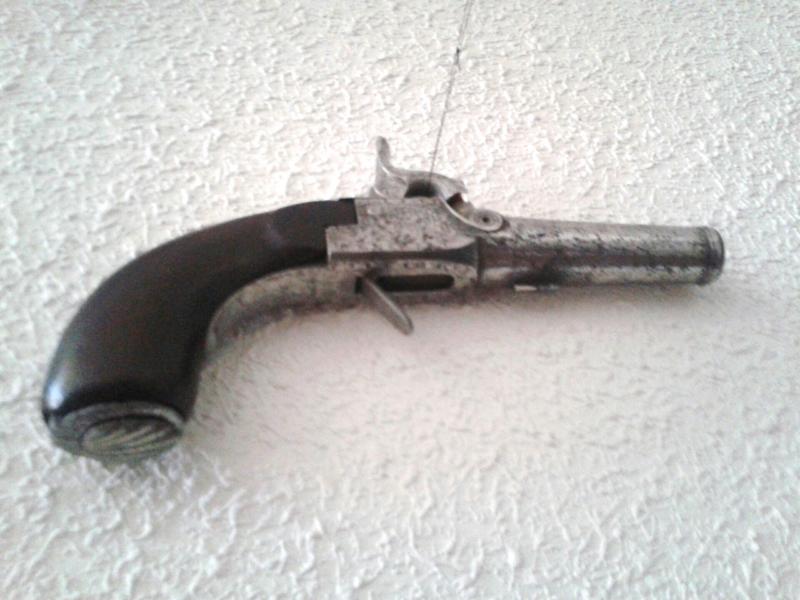 A mi el arma se me va un poco de época para mis gustos pero no creo equivocarme si digo que se trata de una pequeña pistola de bolsillo de las que se conocen como "cachorrillo de pistón".