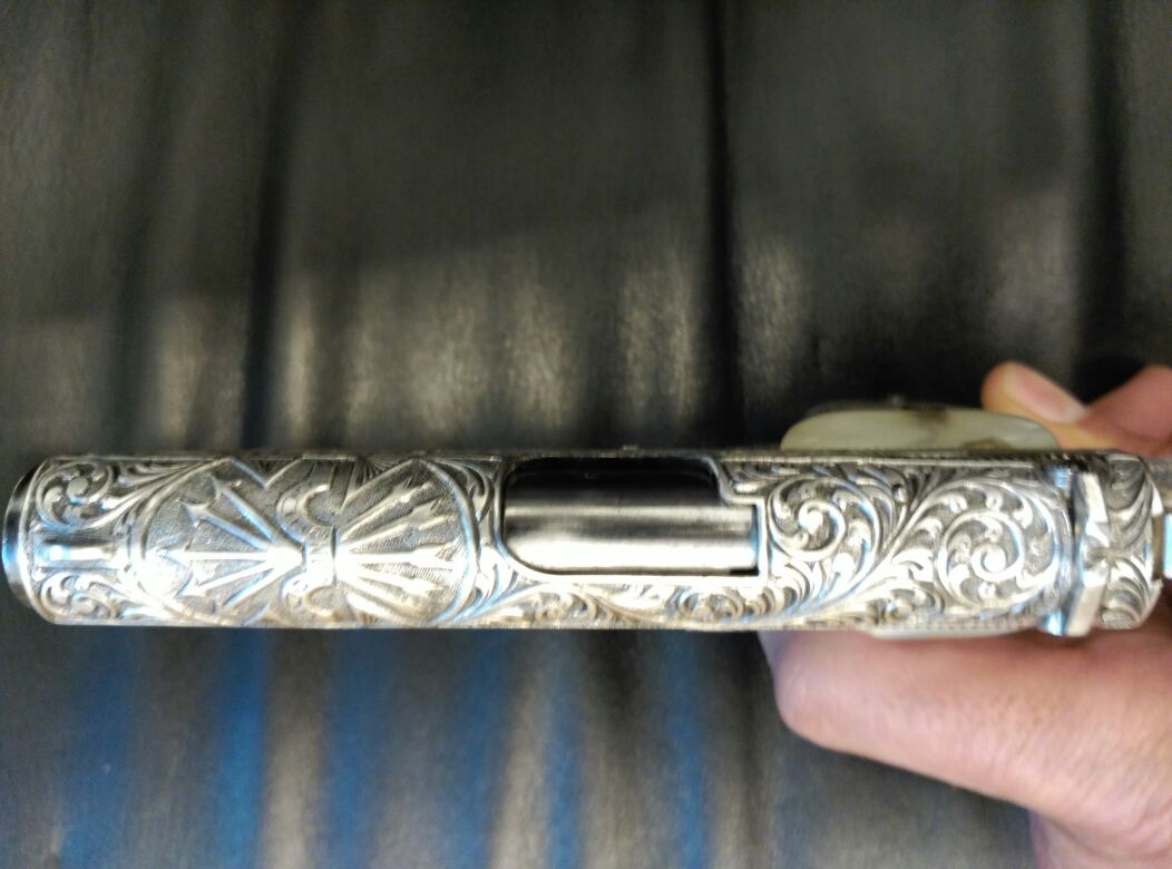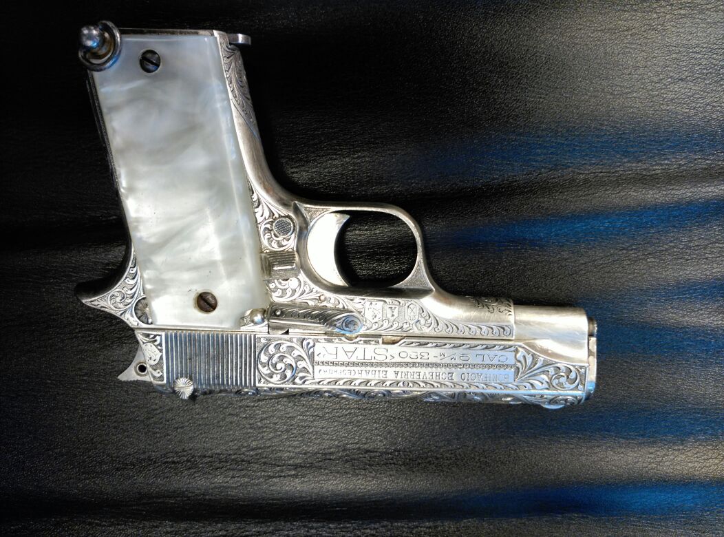 Se trata de una STAR S del Calibre 9 Corto (.380 ACP), con cachas de nacar, un cargador, y "cree y creo" que puede estar plateada. Lo que si esta es burilada y con unos detalles que no se si son "unicos" o al menos "poco comunes".