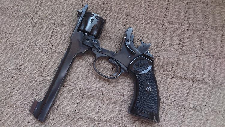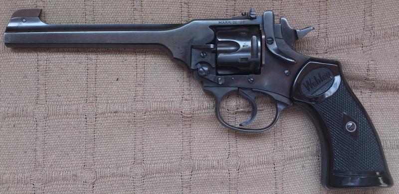 Es un Webley Mk IV "Target Model" de los años 60 o 70, es decir una versión deportiva de este revólver con cañón de 6 pulgadas, punto de mira ampliado y alza regulable.