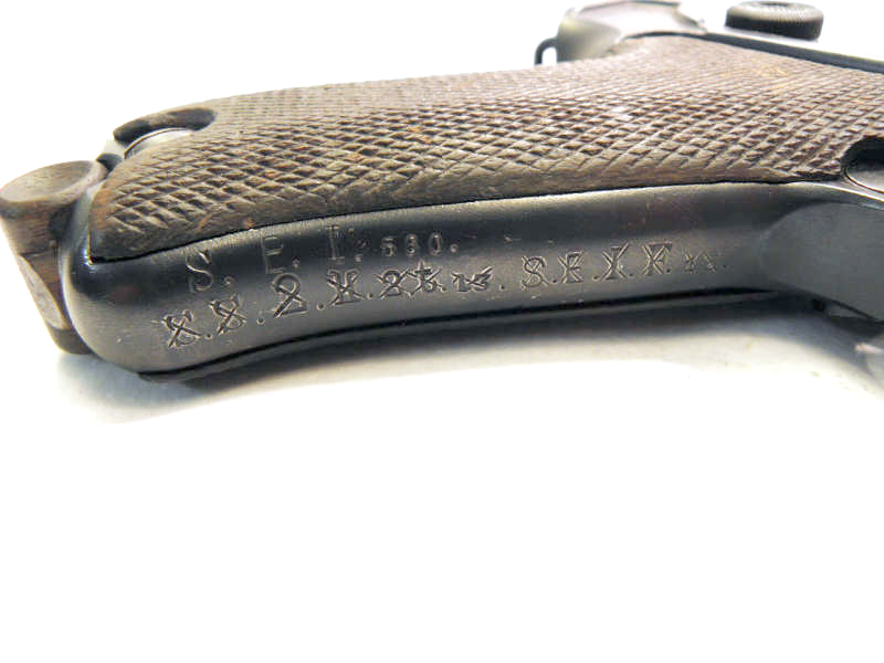 una Luger bastante peculiar en cuanto a sus marcajes de Policía, en la empuñadura.